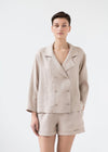 Set of Double breasted long sleeves jacket paired with loose fit Jamies shorts with comfortable elastic fit cut from an incredibly durable linen (flax) fabric.