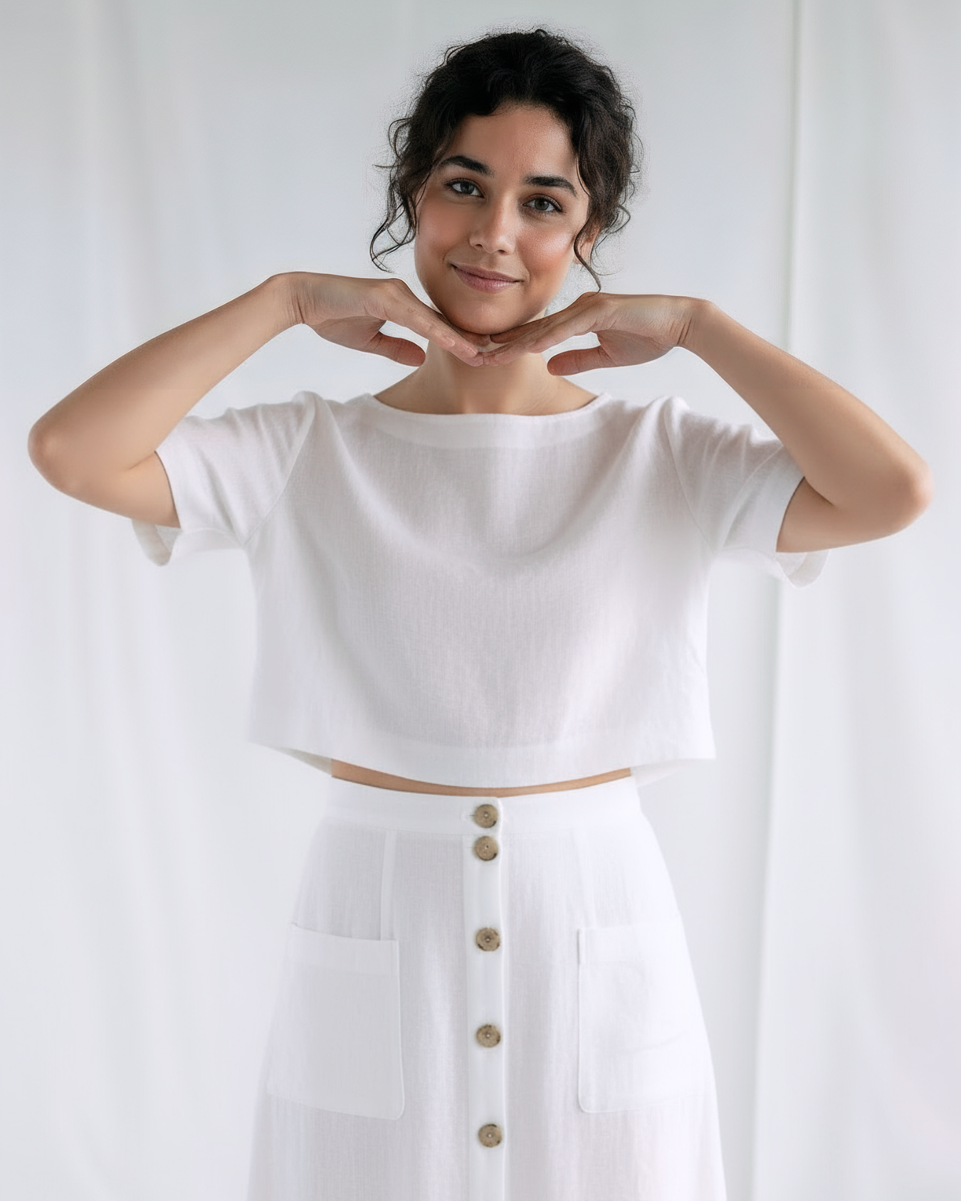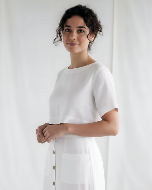 • Finish: Clean, turned-up hem with tonal stitching keeps the look fresh and crisp.