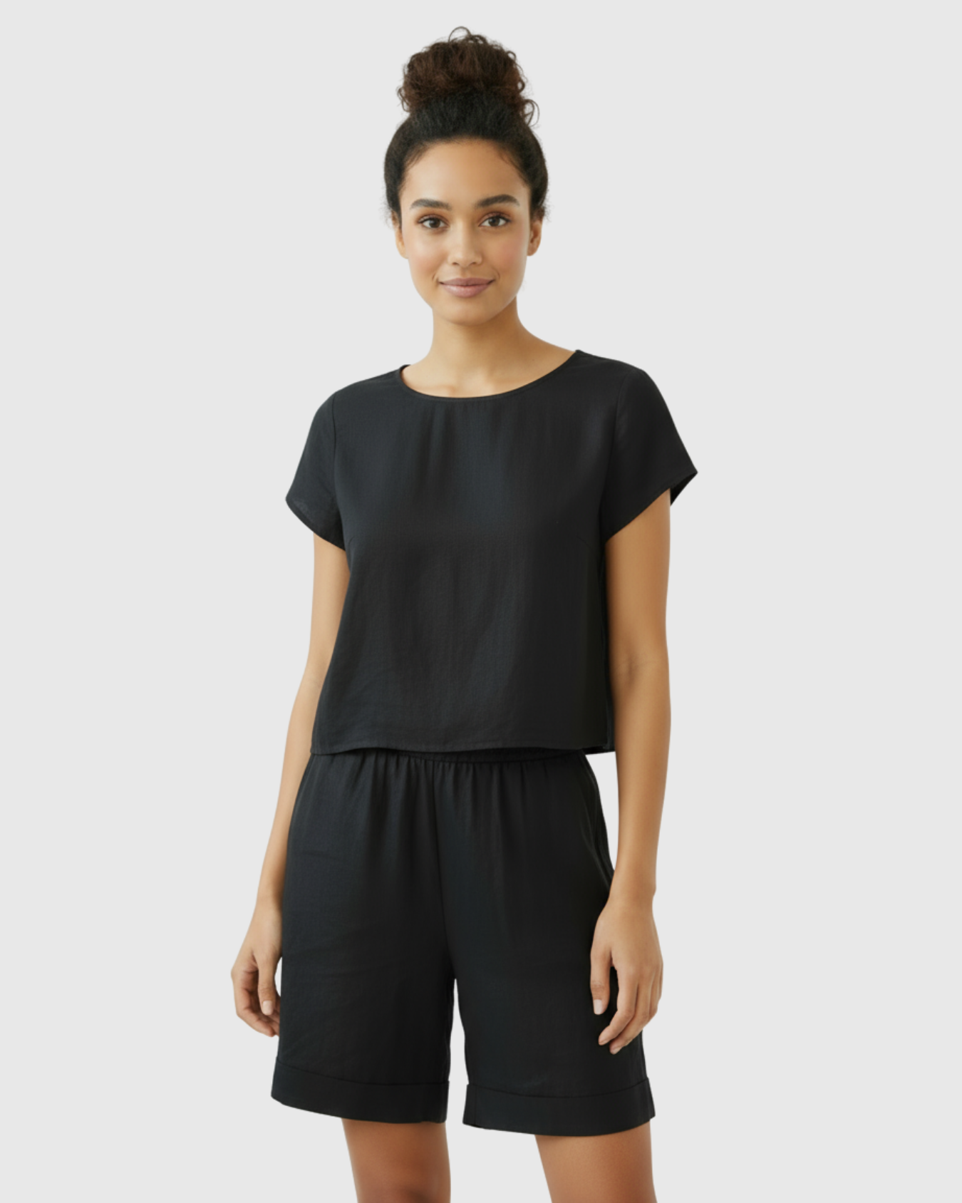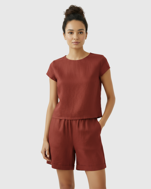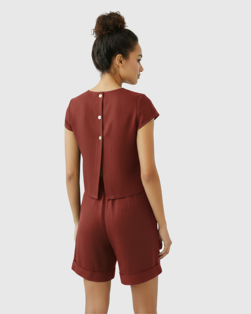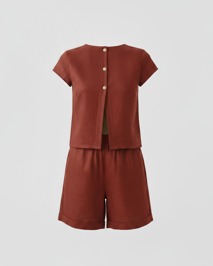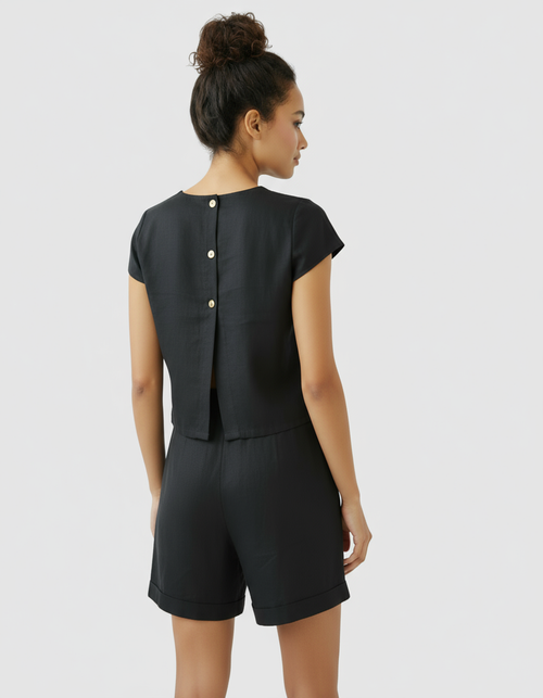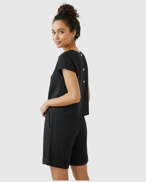 Slip into laid-back polish with the Seaside Siesta. Crafted from a breathable cotton-linen blend, this cap-sleeve Top and Shorts skims the body for an easy, shift-inspired silhouette while keeping you cool from brunch to beach walk. Three natural corozo buttons trail down an airy back slit, adding a hint of surprise to an otherwise minimalist front. Finished with hidden side pockets and a softly cuffed hem, it’s the ultimate pull-on-and-go piece for effortless summer styling.