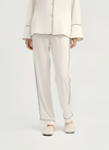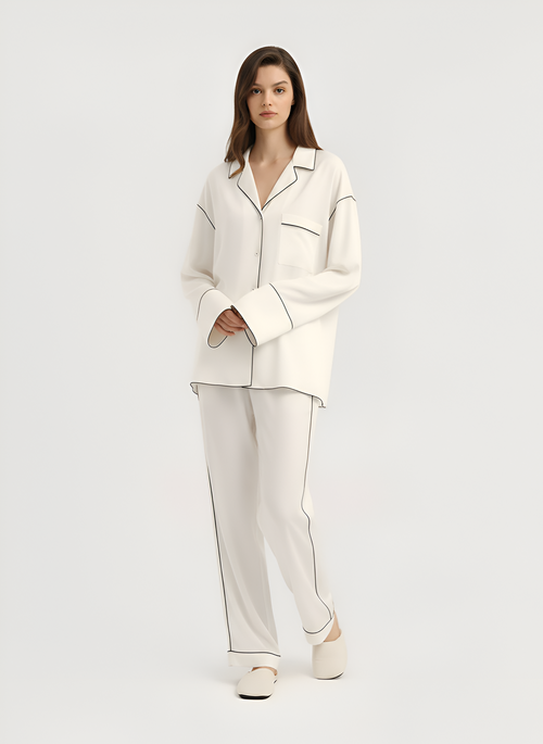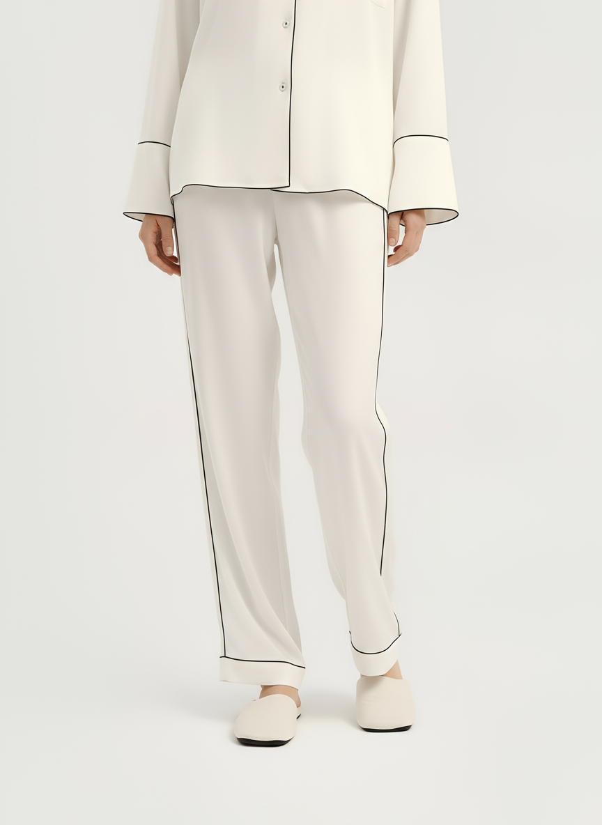 The Jamies Tranquil Horizon Pants redefine cozy sophistication, offering full-length coverage that's as indulgent as it is practical for year-round lounging and sleep. Expertly woven from premium vegan silk—a luxurious, plant-sourced fabric that replicates the exquisite smoothness and gloss of authentic silk without any animal involvement—these pants provide a feather-light embrace that feels like a second skin, gliding effortlessly with every step. Presented in a serene ivory white with bold black piping tracing the elastic waistband, outseams, and ankle cuffs, they create a streamlined, elongated silhouette that enhances the overall elegance of the set when paired with the Lunar Caress Button-Up. The relaxed straight-leg fit tapers gently at the ankles for a modern touch, ensuring unrestricted movement whether you're curling up in bed, practicing morning stretches, or simply relaxing at home, while the mid-rise waist sits comfortably without digging in. Breathable and thermoregulating, the material adapts to your body's needs, drawing away sweat in warmer conditions and providing subtle warmth in cooler ones, all while being hypoallergenic and gentle for prolonged wear. Additional features like the adjustable drawstring waist and subtle side pockets add functionality without compromising style, making these pants versatile for travel, spa days, or even as elevated loungewear for unexpected guests. True to Jamies' sustainable vision, the Tranquil Horizon Pants are crafted with eco-conscious processes, including recycled water usage and non-toxic finishes, ensuring they're as kind to the earth as they are to your wardrobe. Available in inclusive sizing, these pants evoke the calm of a distant horizon, inviting you to sink into profound relaxation and emerge revitalized, blending timeless design with forward-thinking ethics for the ultimate in mindful comfort.